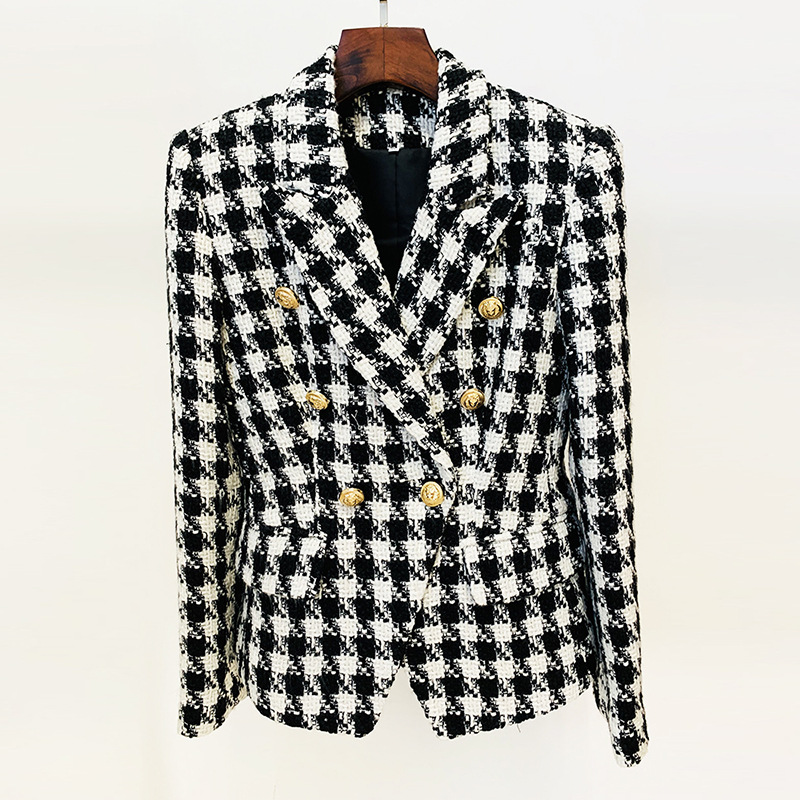 Tweed blazer with gold buttons.