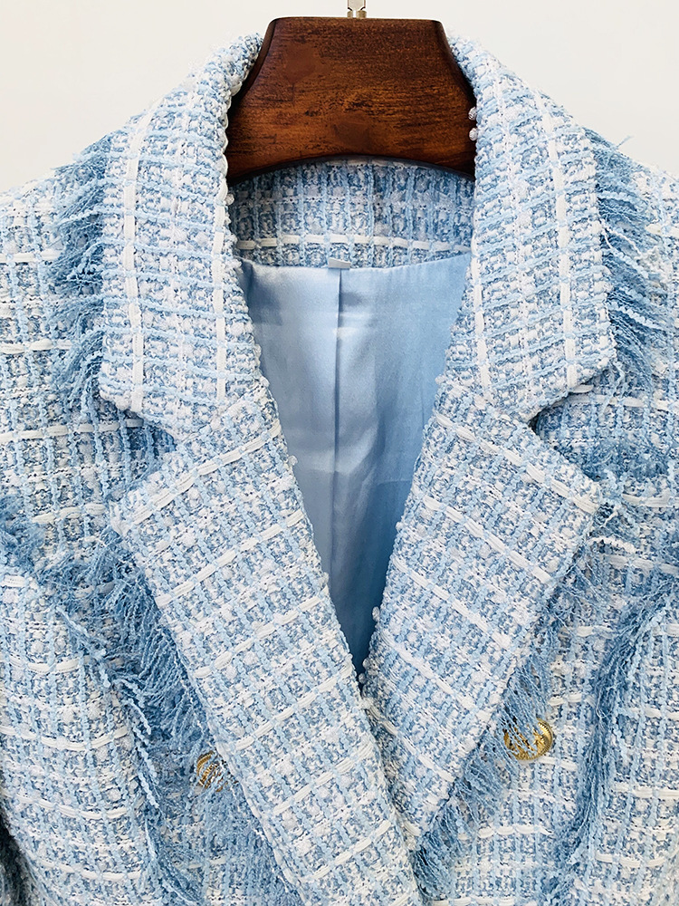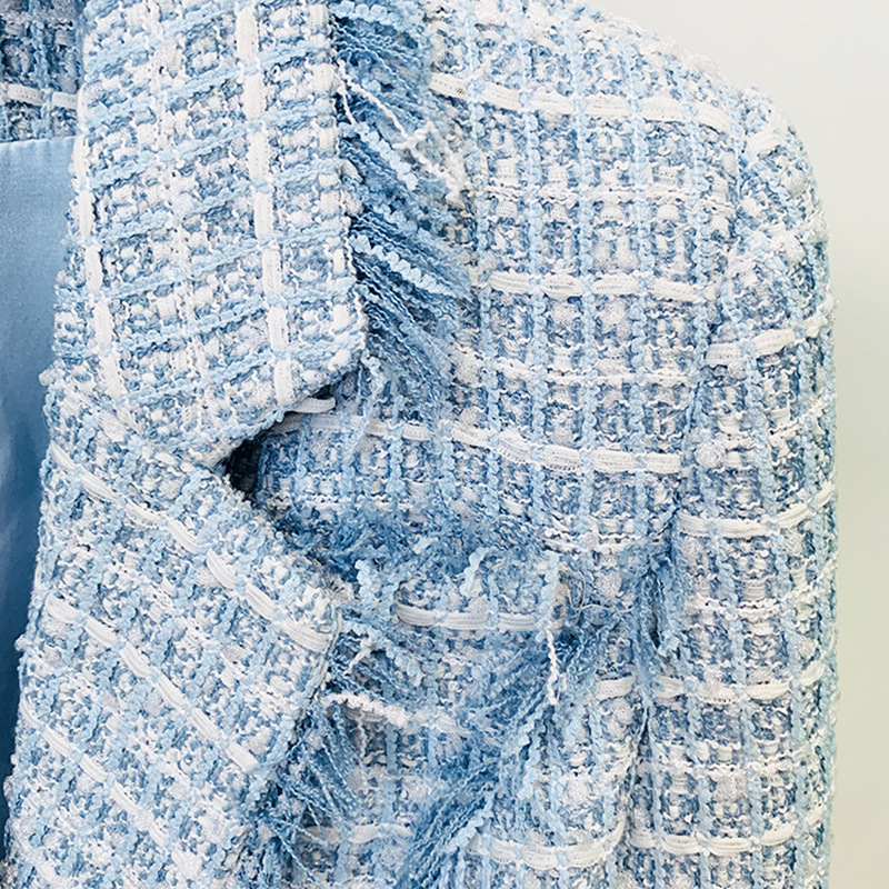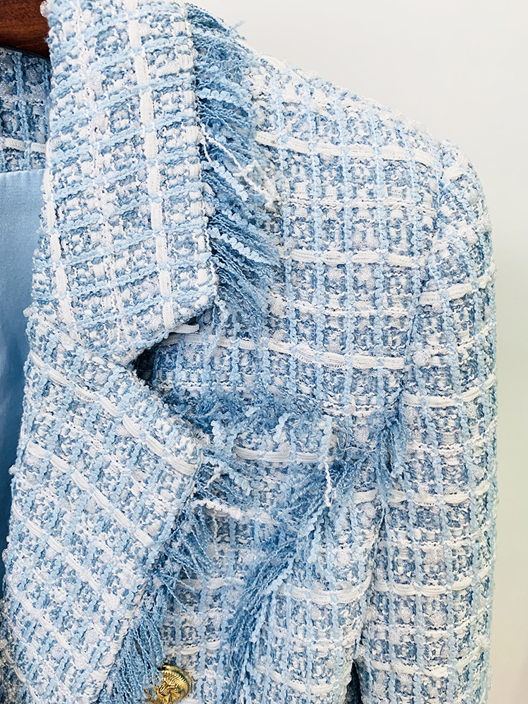 Light blue tweed blazer with gold buttons.